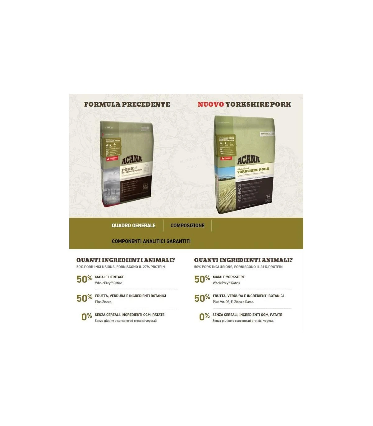 Senza concentrati proteici vegetali, ACANA Yorkshire Pork contiene ben il 50% di maiale. -
