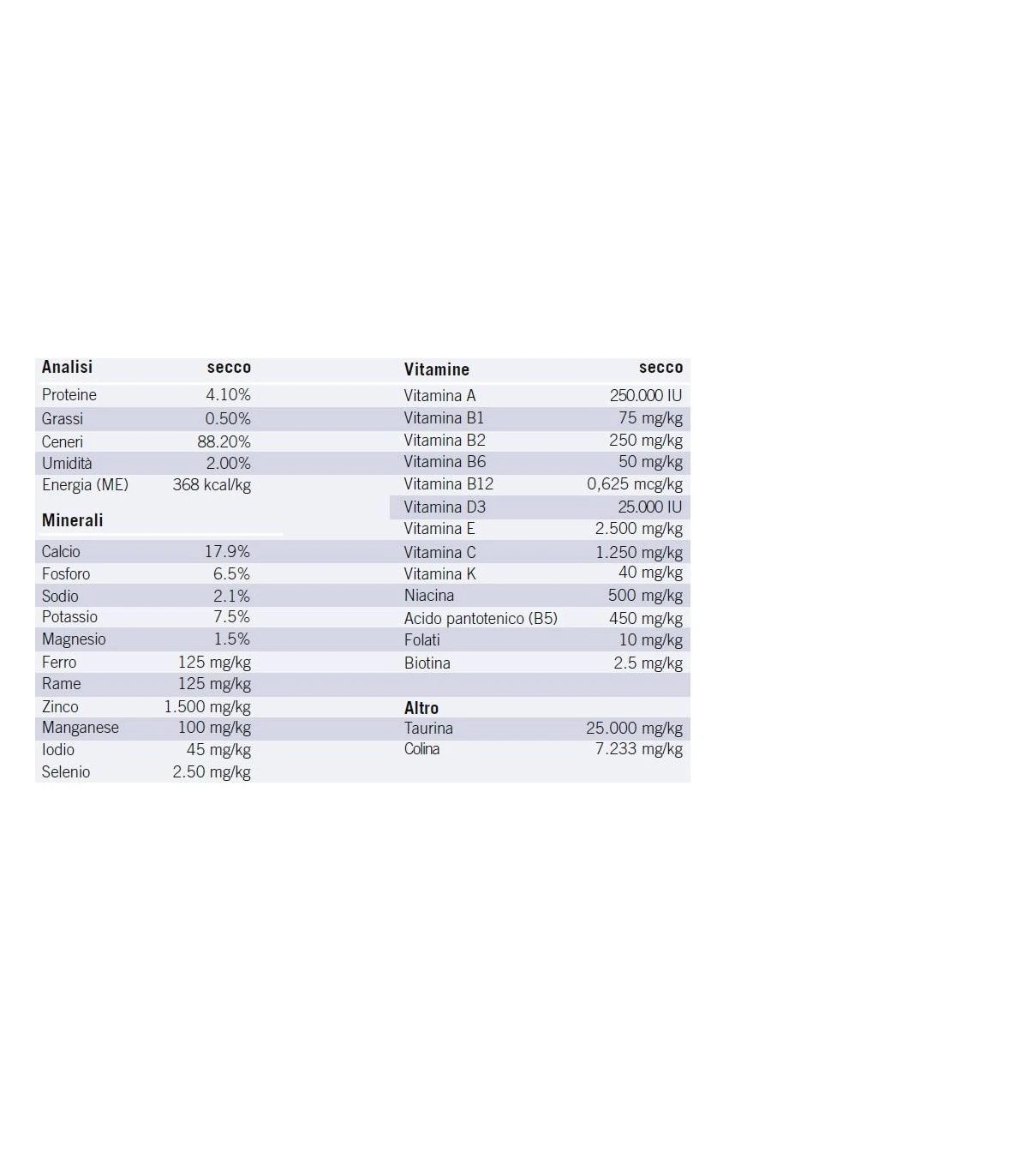 Secco:Â minerali, vitamine, olio e grassi (olio di soia).
